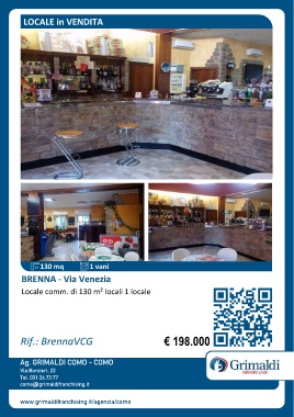 LOCALE in VENDITA M 130 mq E 1 vani BRENNA - Via Venezia Locale comm. di 130 m² locali 1 locale Rif.: BrennaVCG € 198.000 Ag. GRIMALDI COMO - COMO Via Borsieri, 22 Tel. 031 26.73.77 como@grimaldifranchising.it www.grimaldifranchising.it/agenzia/como