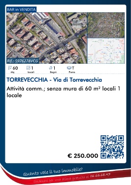 BAR in VENDITA Rif.: 5976278VCG M 60 E 1 B 1 UT Mq Locali Bagni Piano TORREVECCHIA - Via di Torrevecchia Attività comm.; senza mura di 60 m² locali 1 locale € 250.000 Quanto vale il tuo immobile? 06 63.68.47 Chiamaci per una stima gratuita al